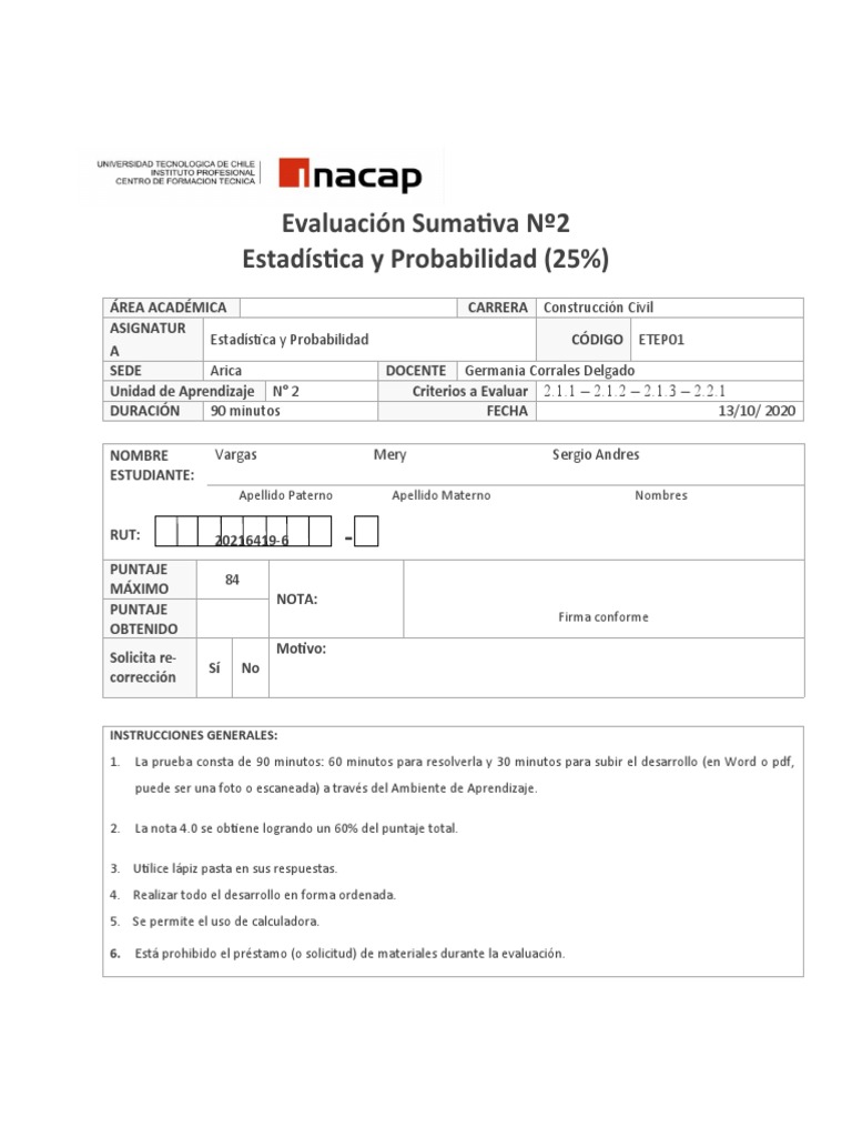 Prueba Sumativa 2 Estadistica Y Probabilidad Realizada Pdf Probabilidades Y Estadisticas Ensenanza De Matematica